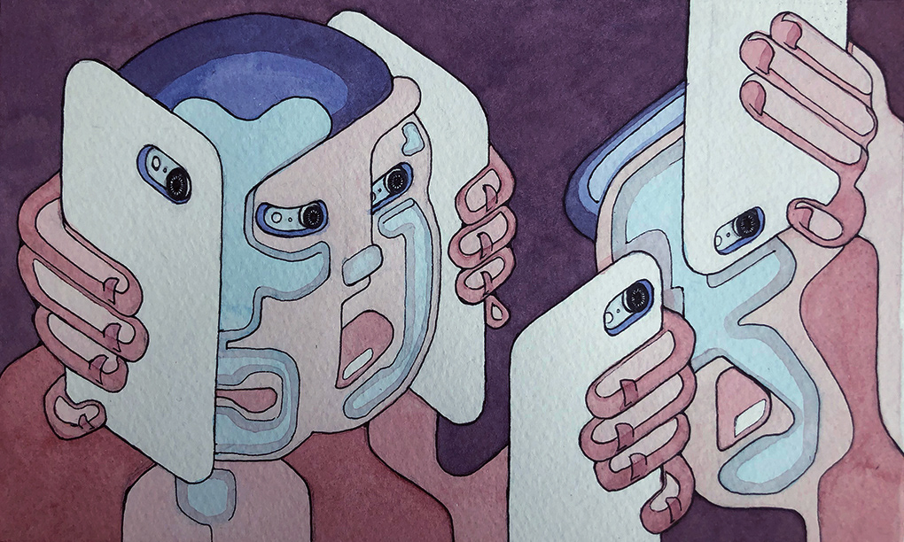 For a mock article about the addictive nature of technology and social media. Developed from preliminary sketches: pictured to the right.