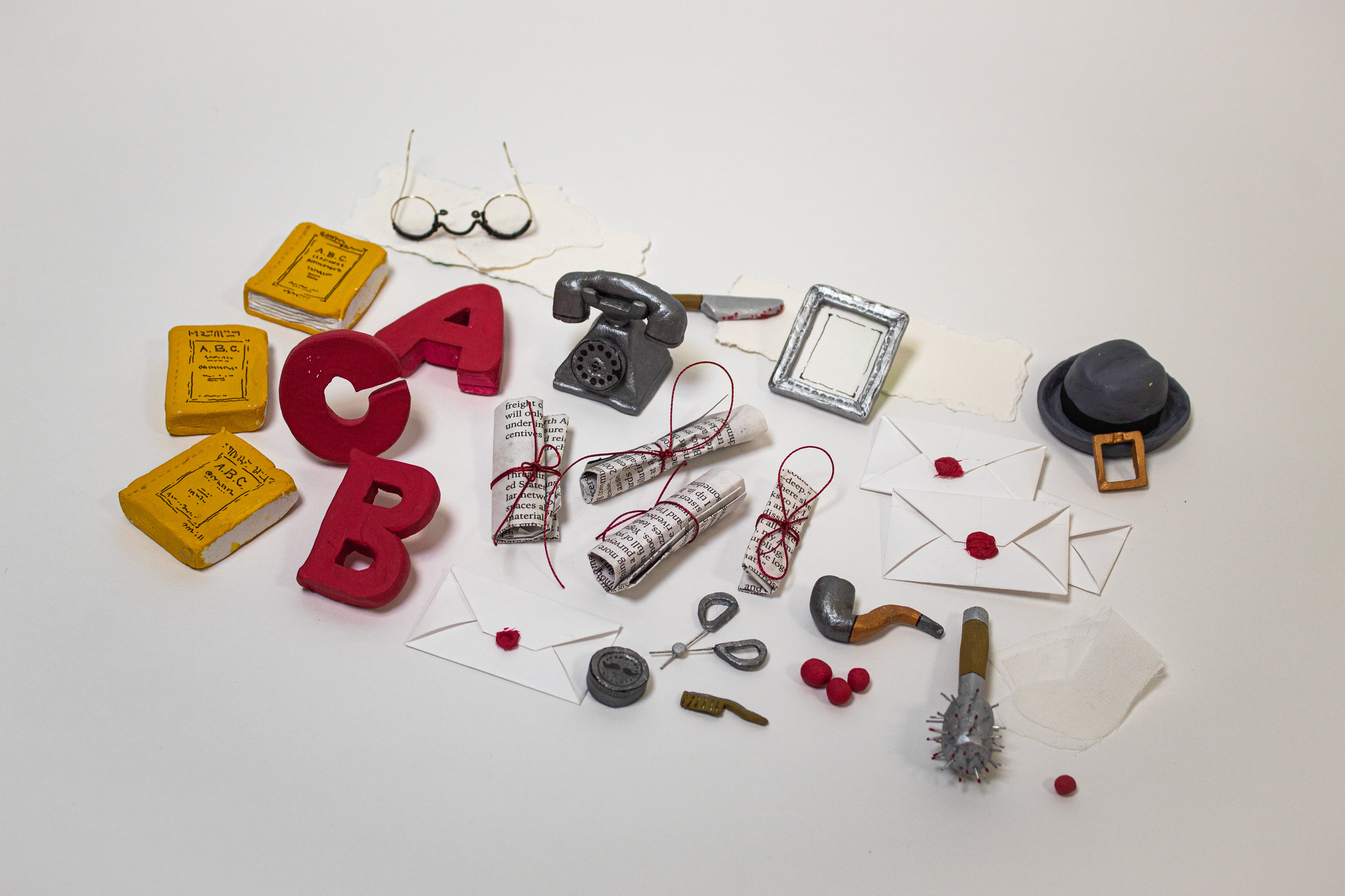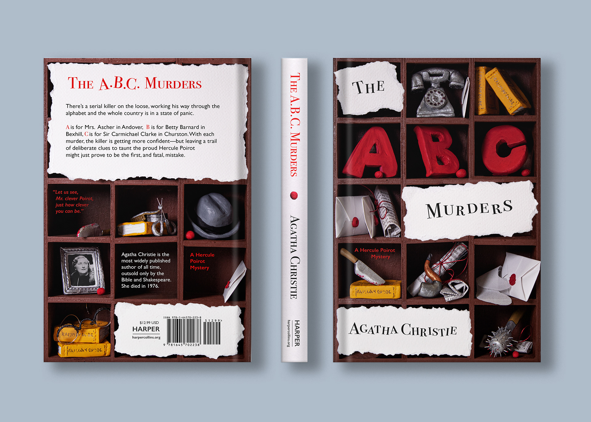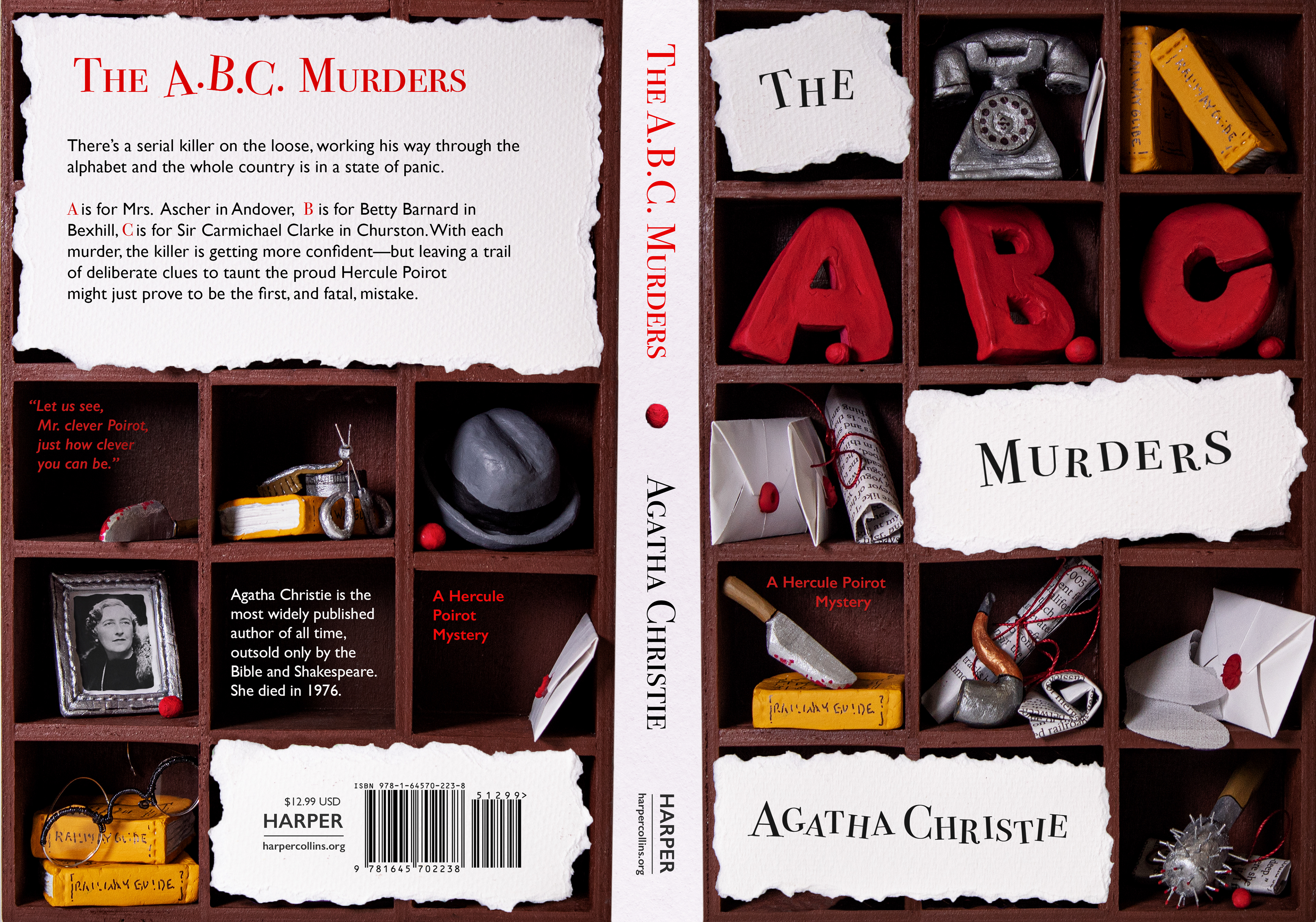 Mock book cover design for Agatha Christie's The ABC Murders. Assembled from handmade sculptures and found objects; original layout and design created in Adobe Photoshop.
