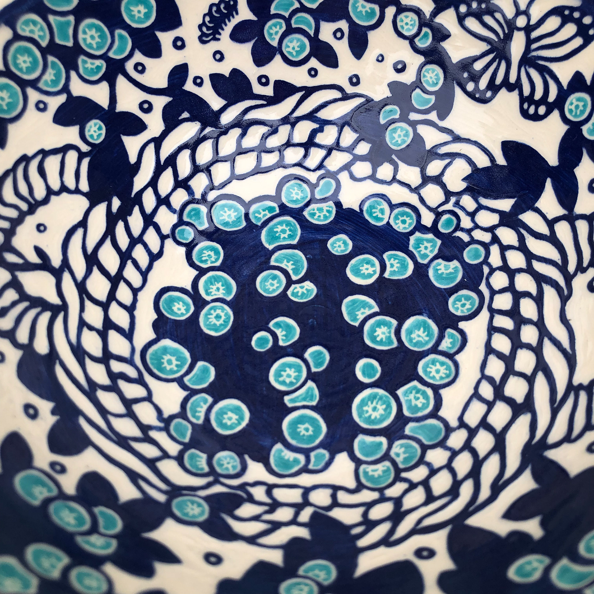 Wheel thrown porcelain with sgraffito surface designs carved through layers of painted underglaze.