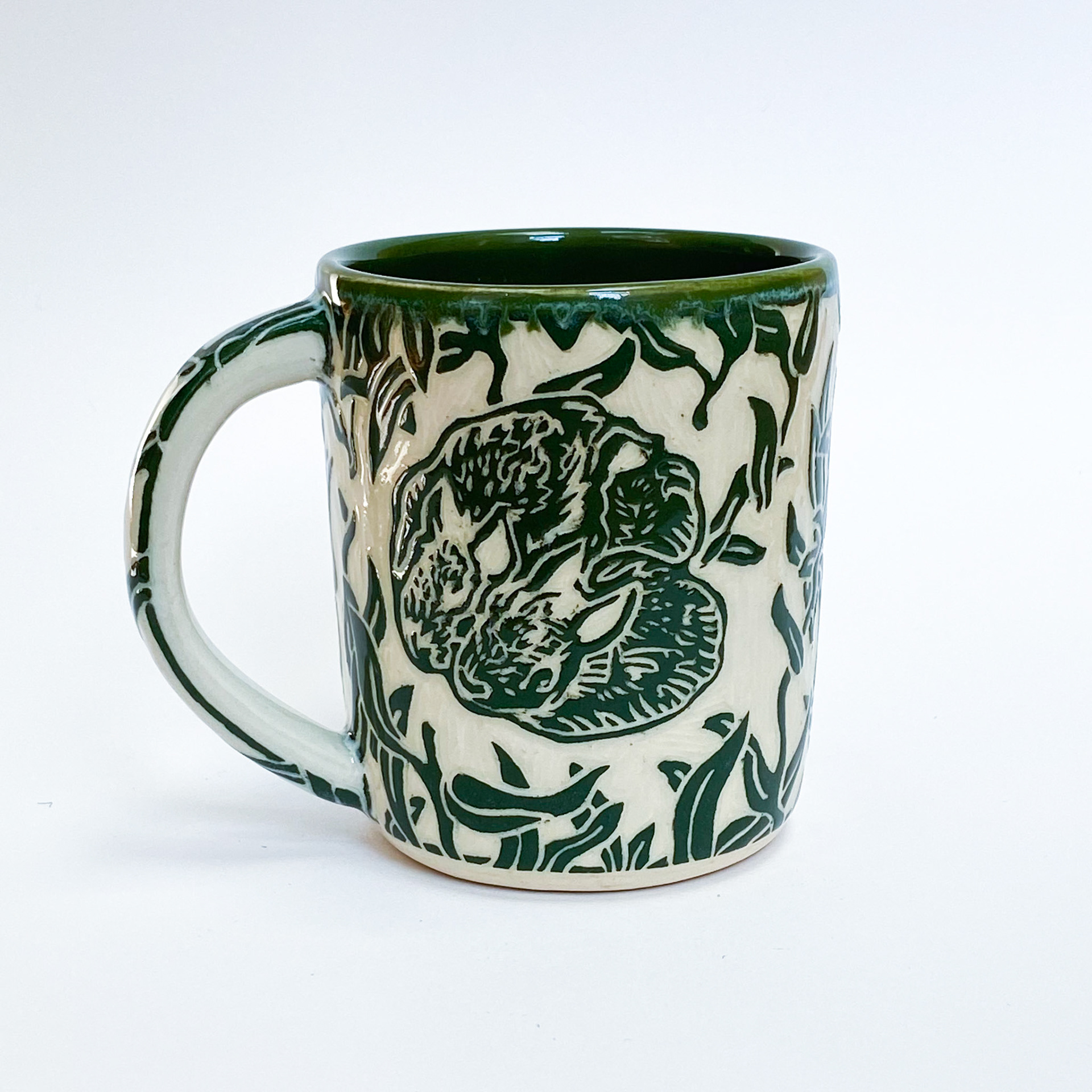 Wheel thrown porcelain with sgraffito surface designs carved through layers of painted underglaze.