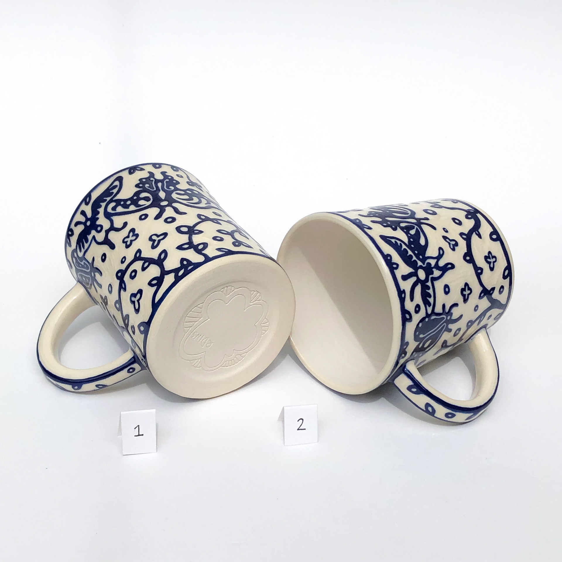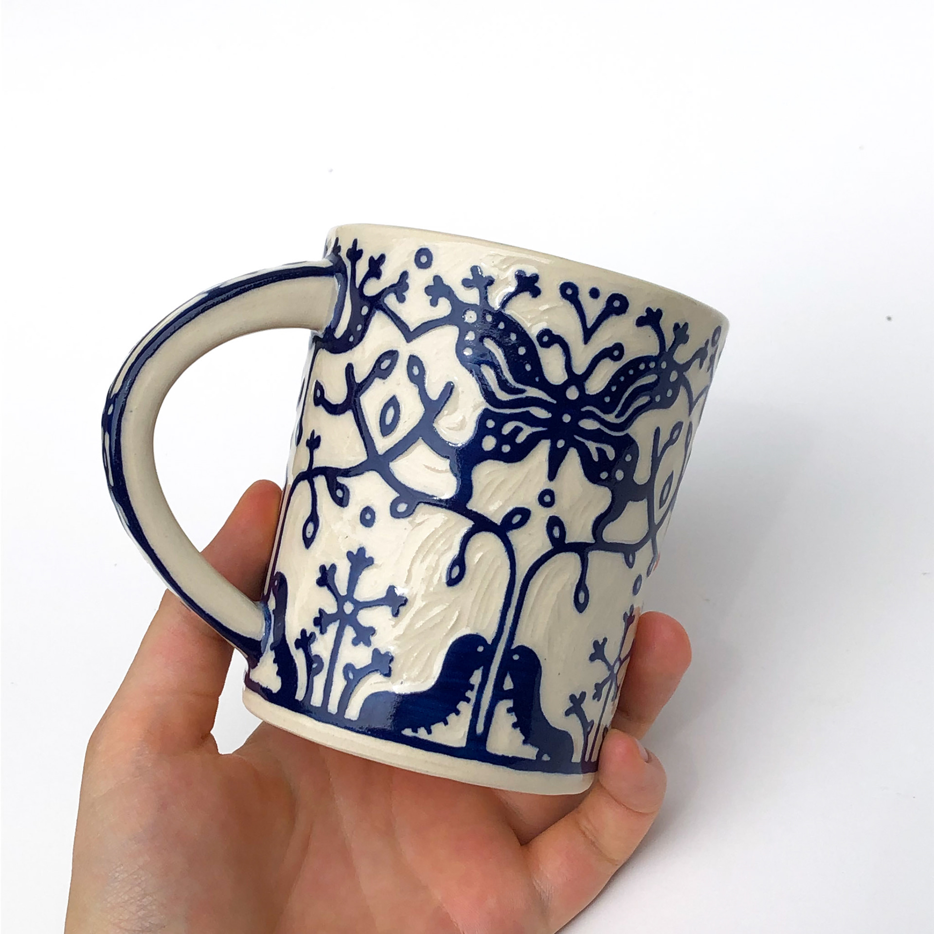 Wheel thrown porcelain with sgraffito surface designs carved through layers of painted underglaze.