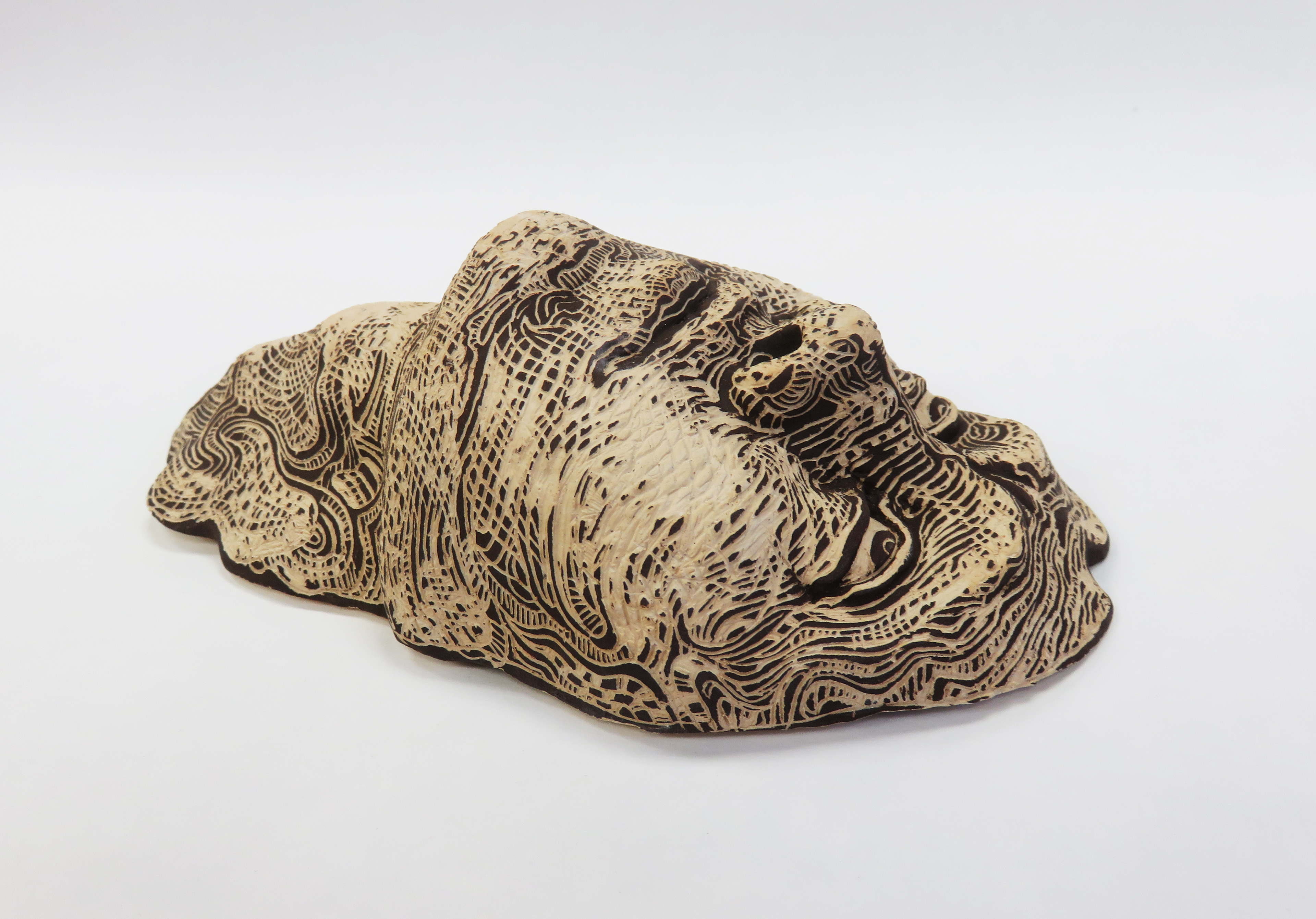 Hand-built stoneware sculpture with sgraffito surface designs carved through layers of painted underglaze.