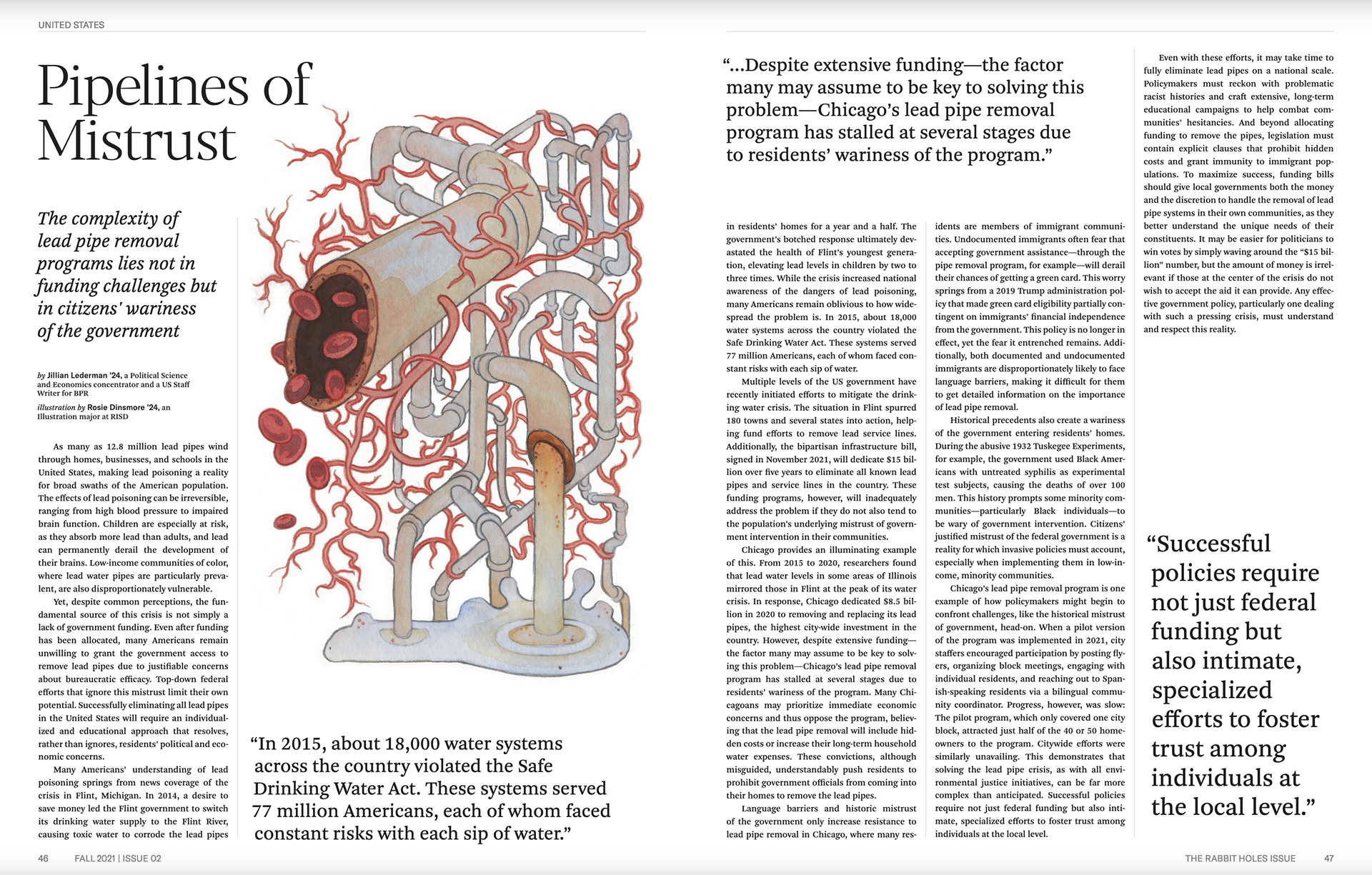 An Illustration for an article by Jillian Lederman on the complexity of lead pipe removal in the United States. Published in The Brown Political Review Magazine, Fall 2021, Issue 2.