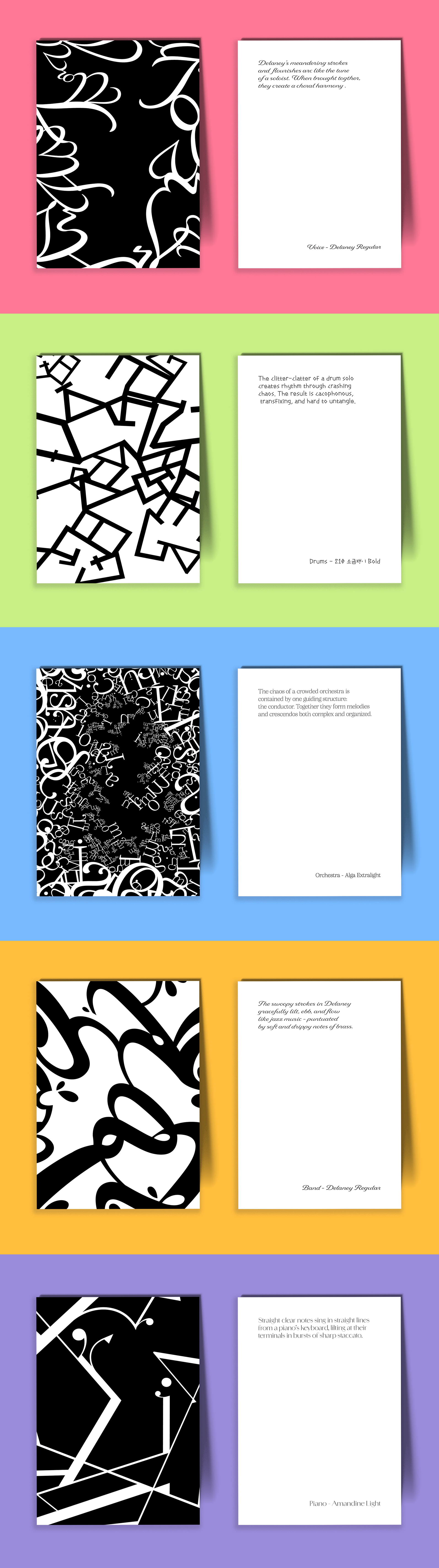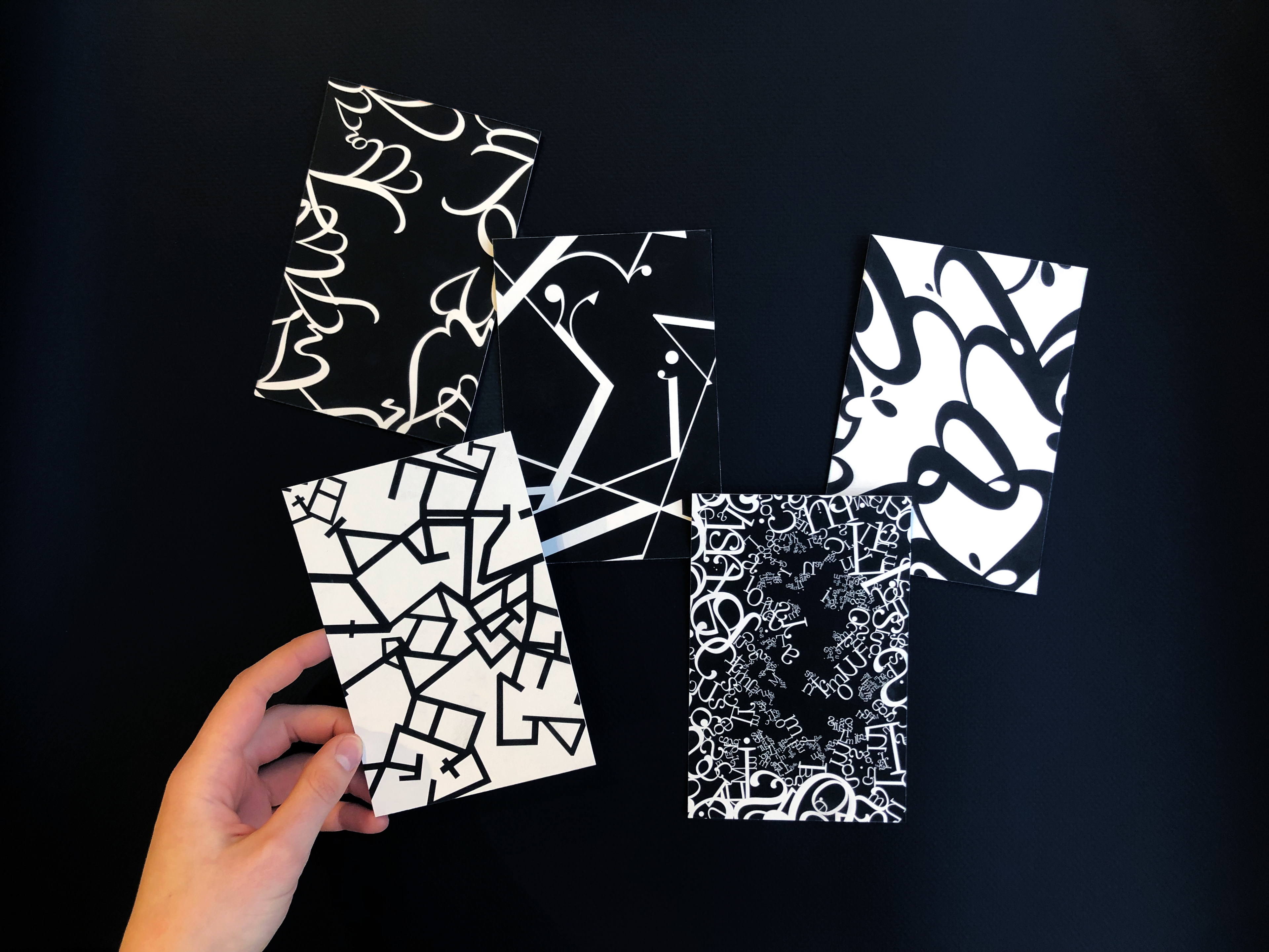 Set of 5 double-sided 4x6 in. postcards, creating using only letterforms. Designed in Adobe Illustrator.