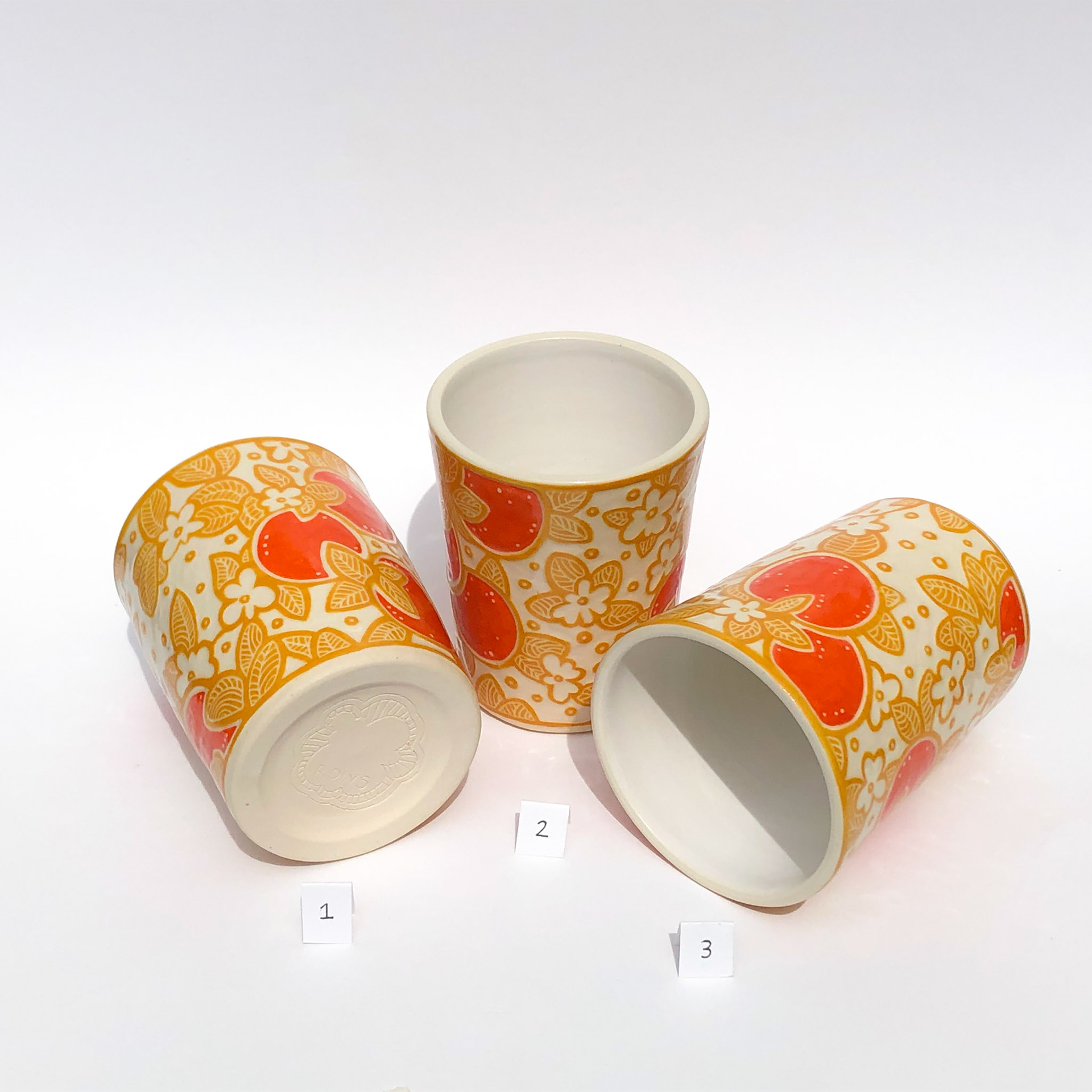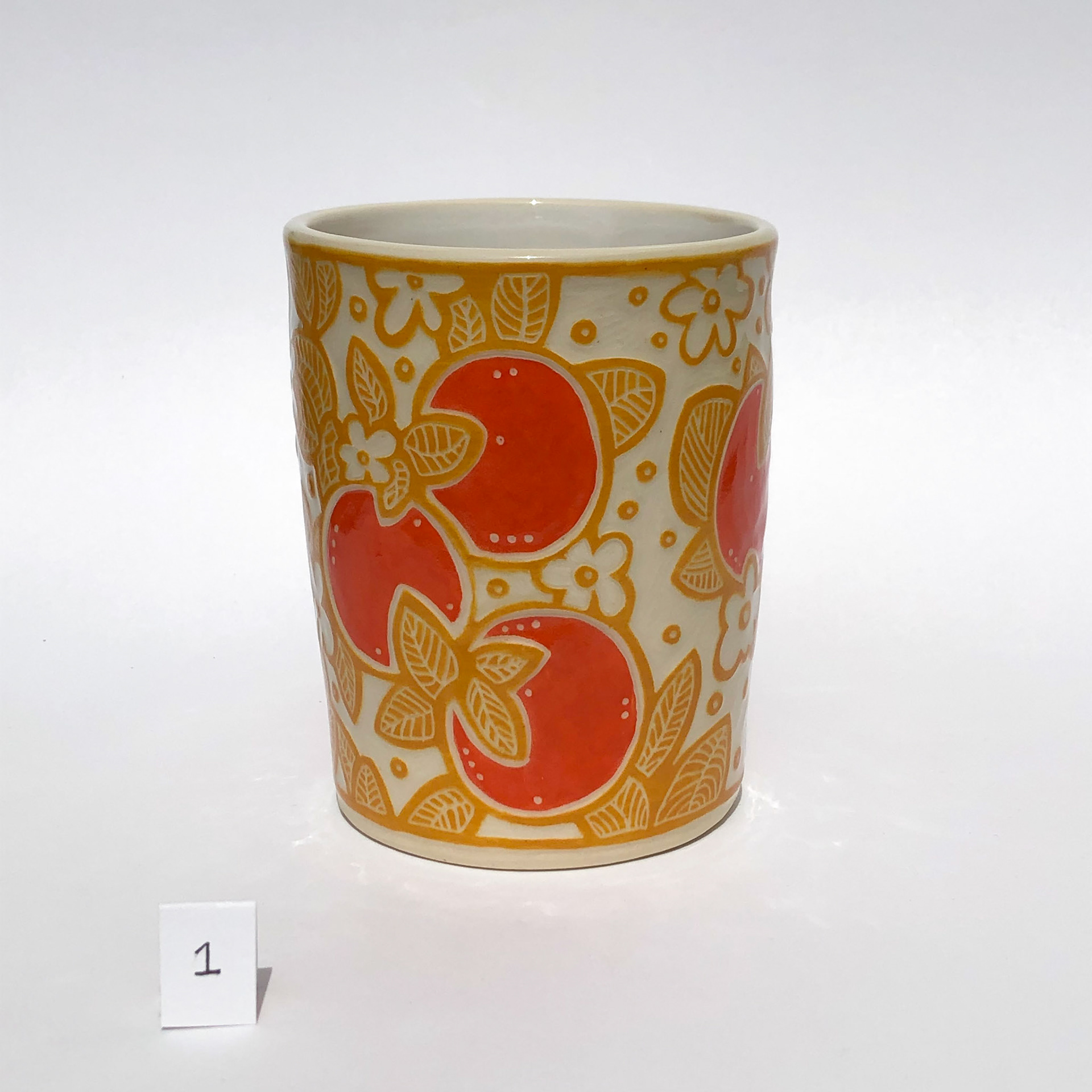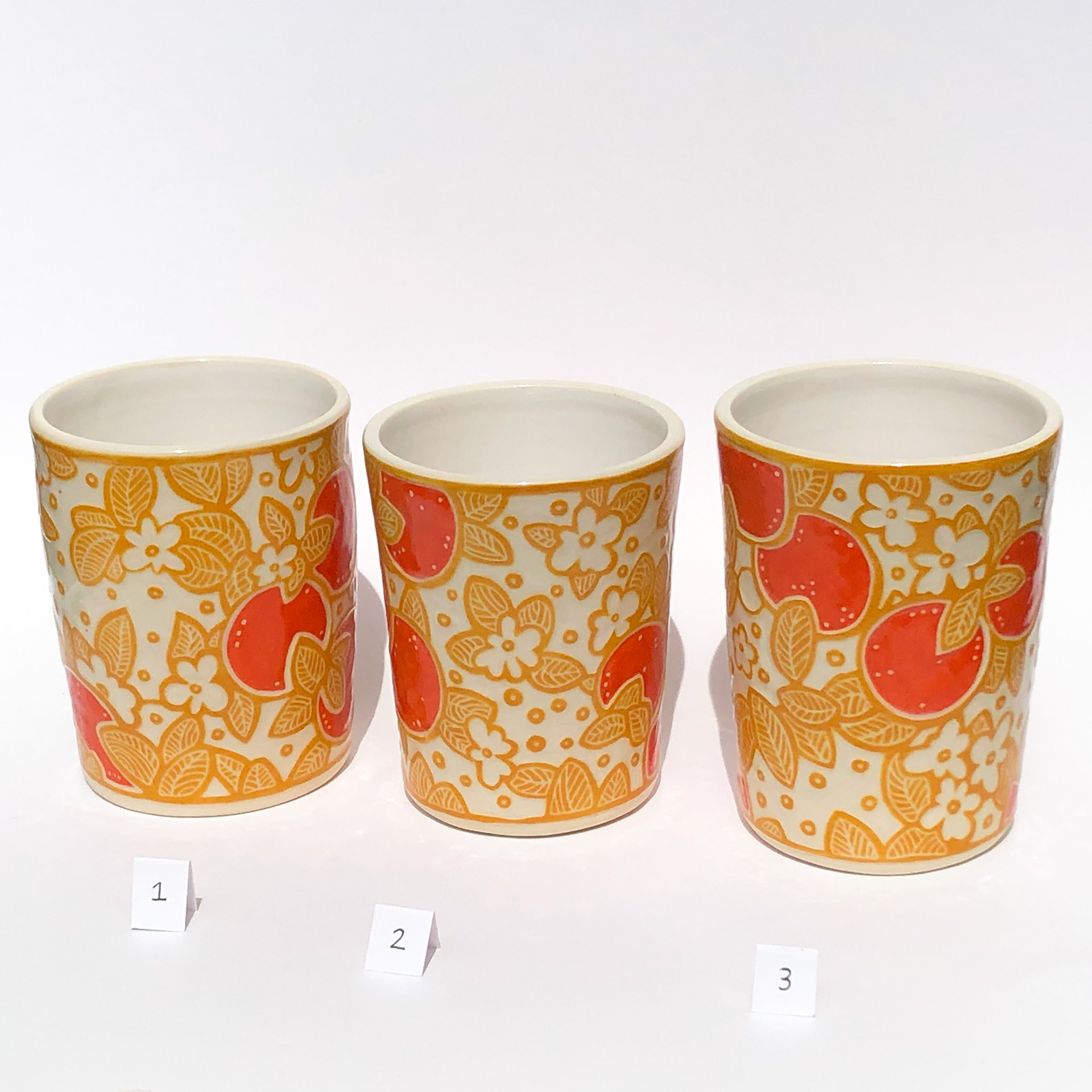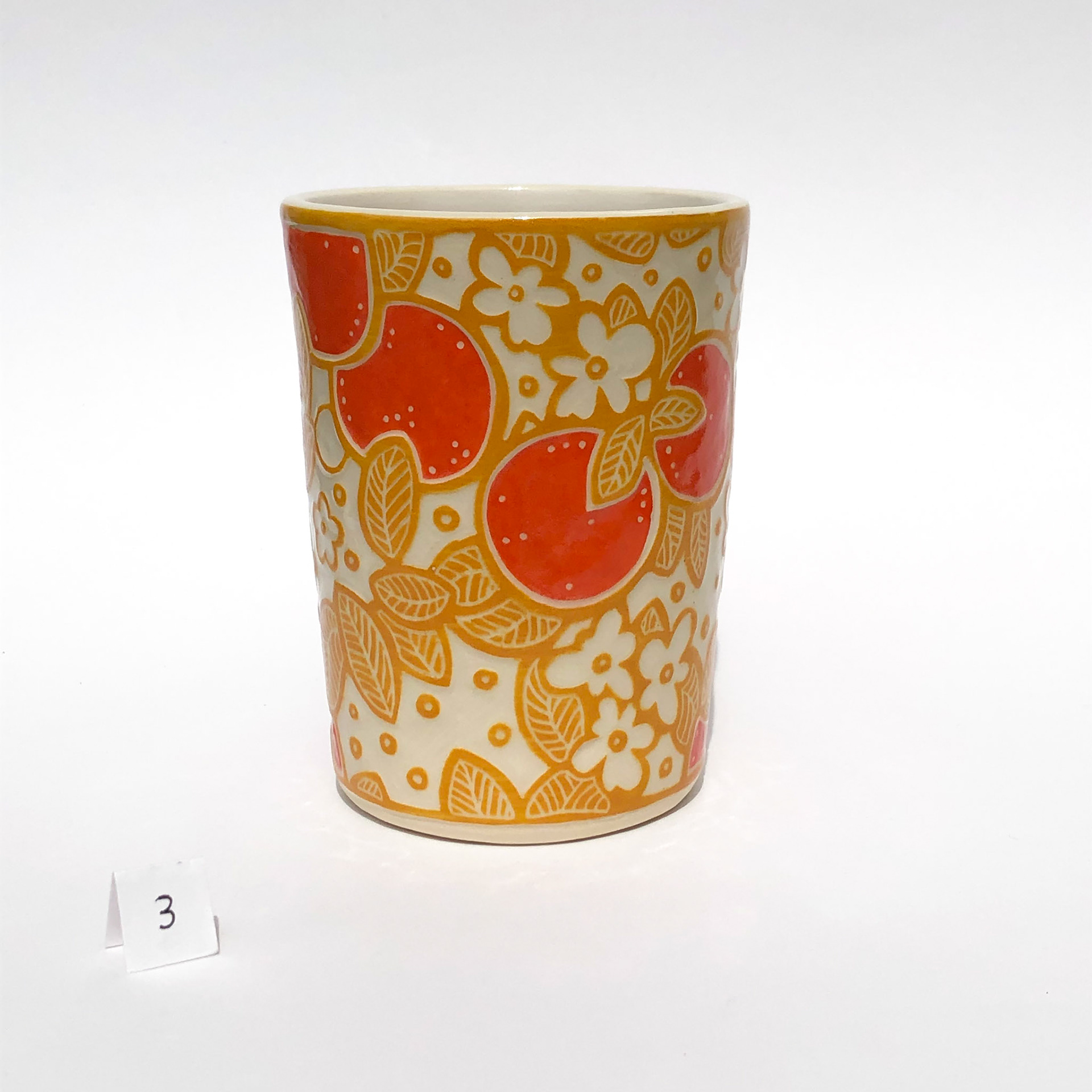 Wheel thrown porcelain with original sgraffito surface designs carved through layers of painted underglaze.
