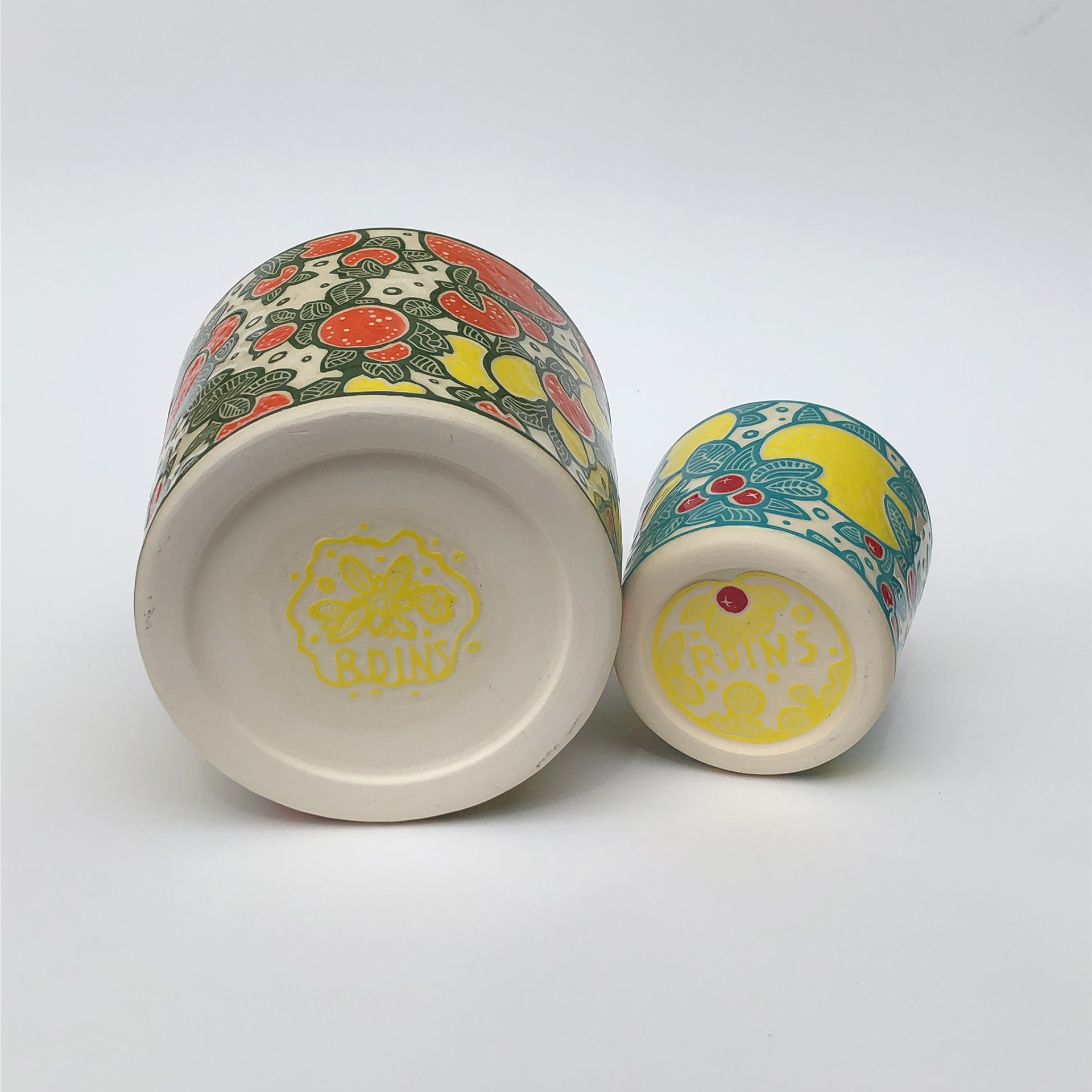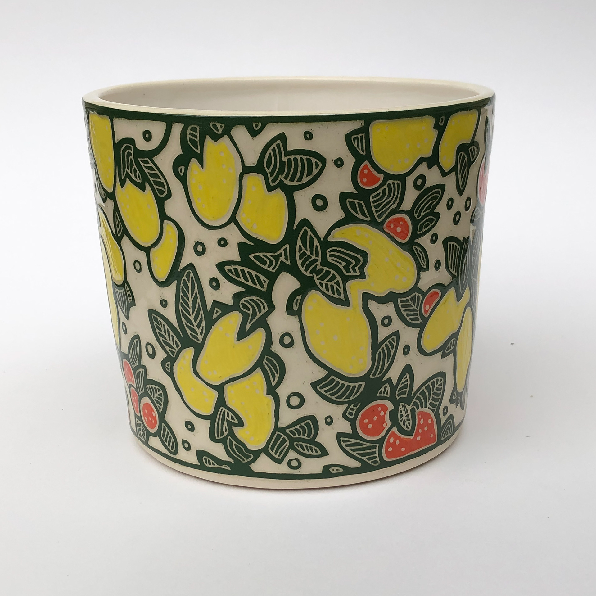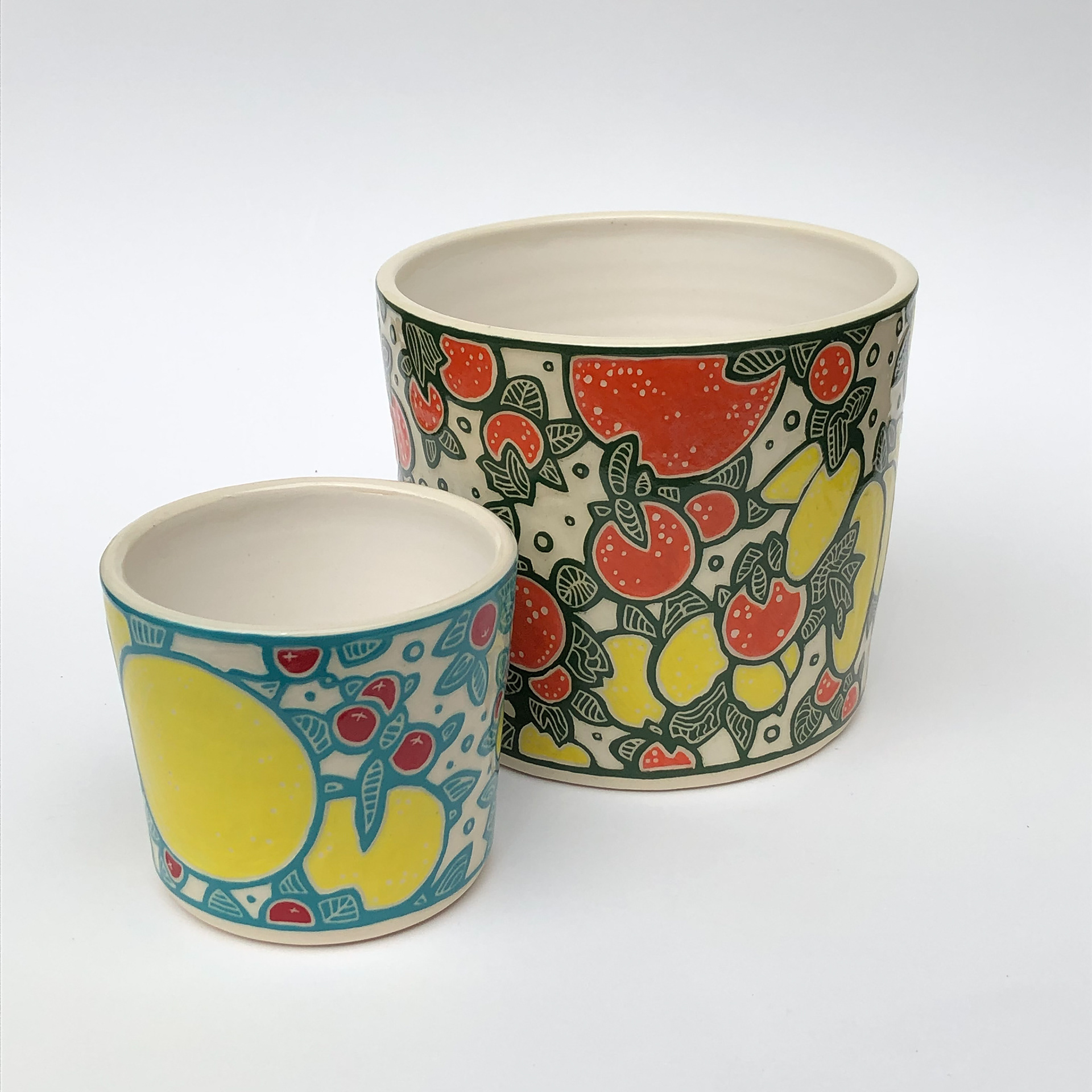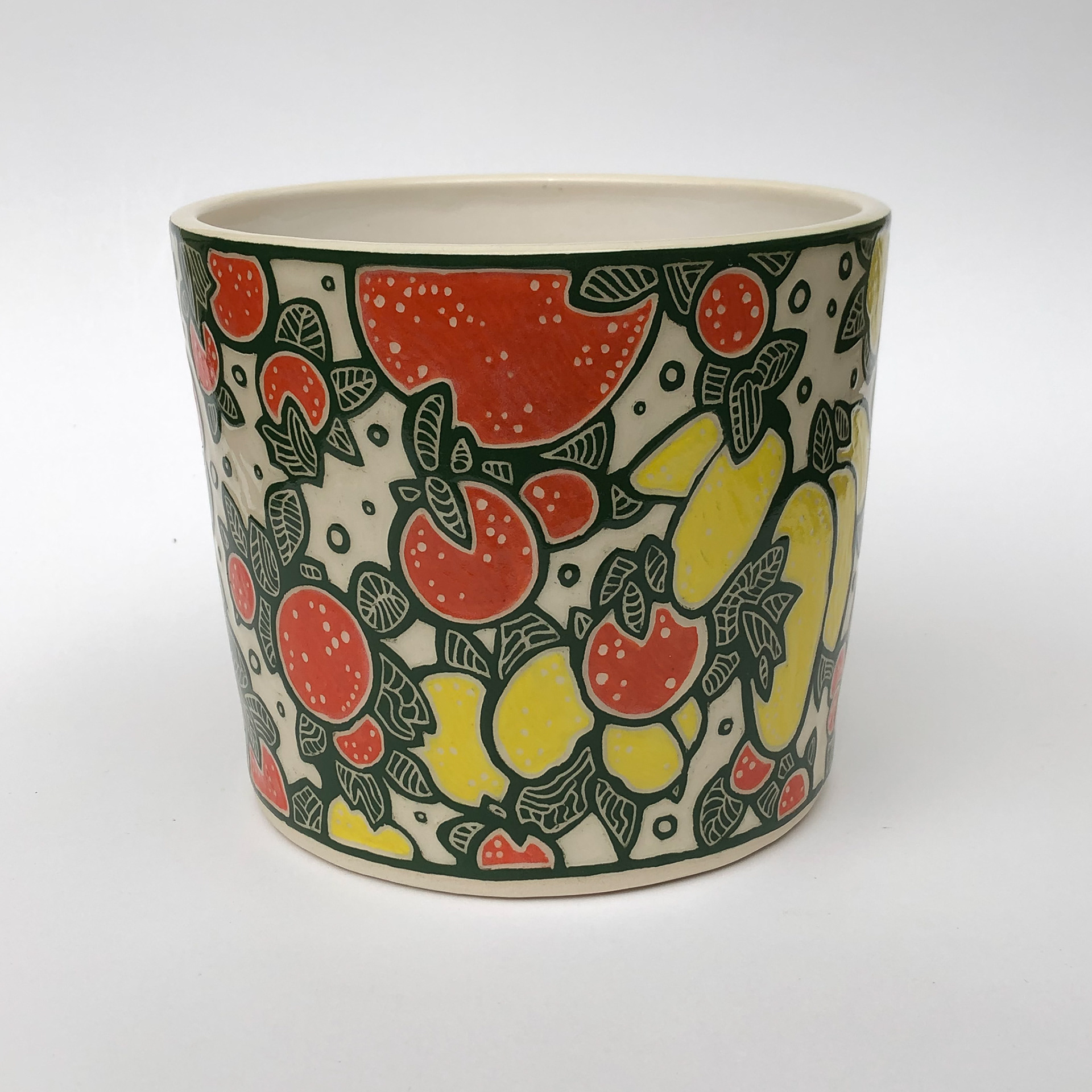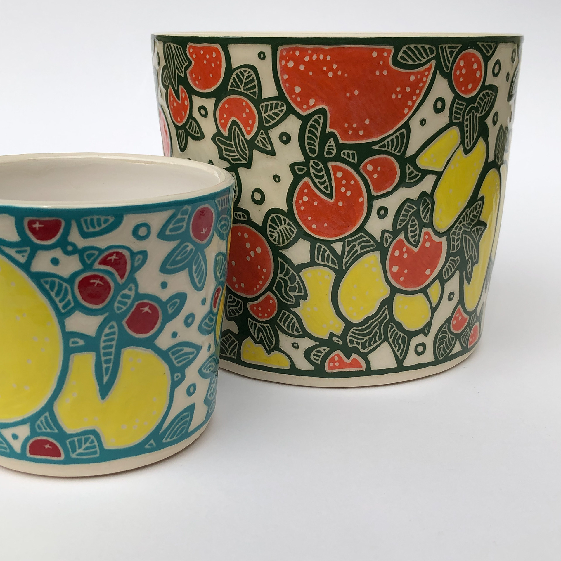 Wheel thrown porcelain with sgraffito surface designs carved through layers of painted underglaze.