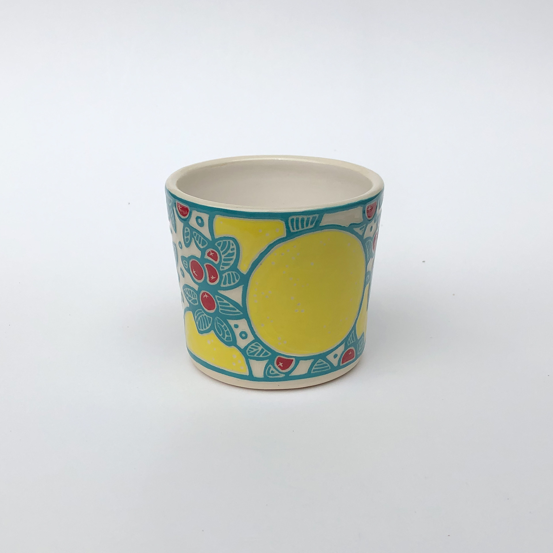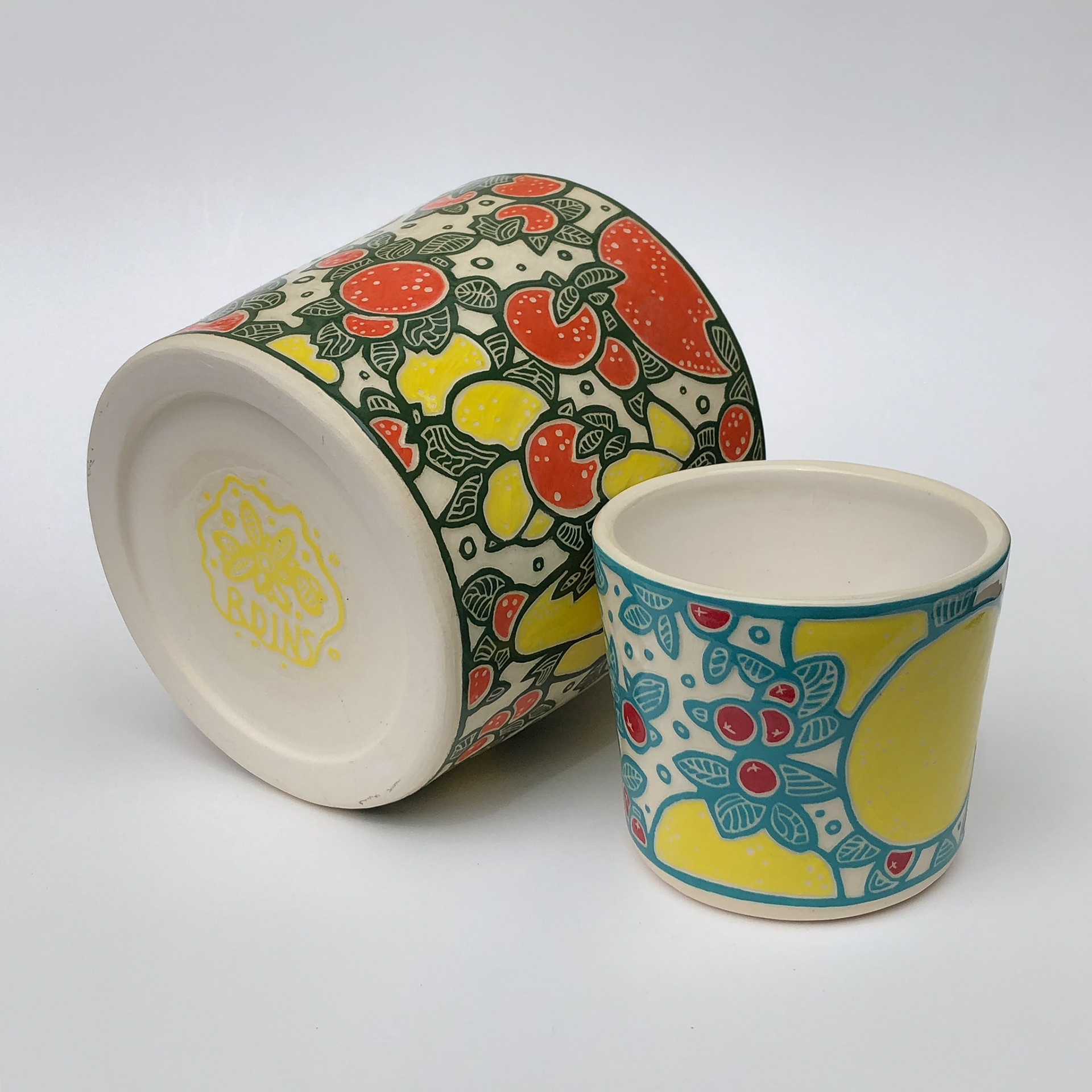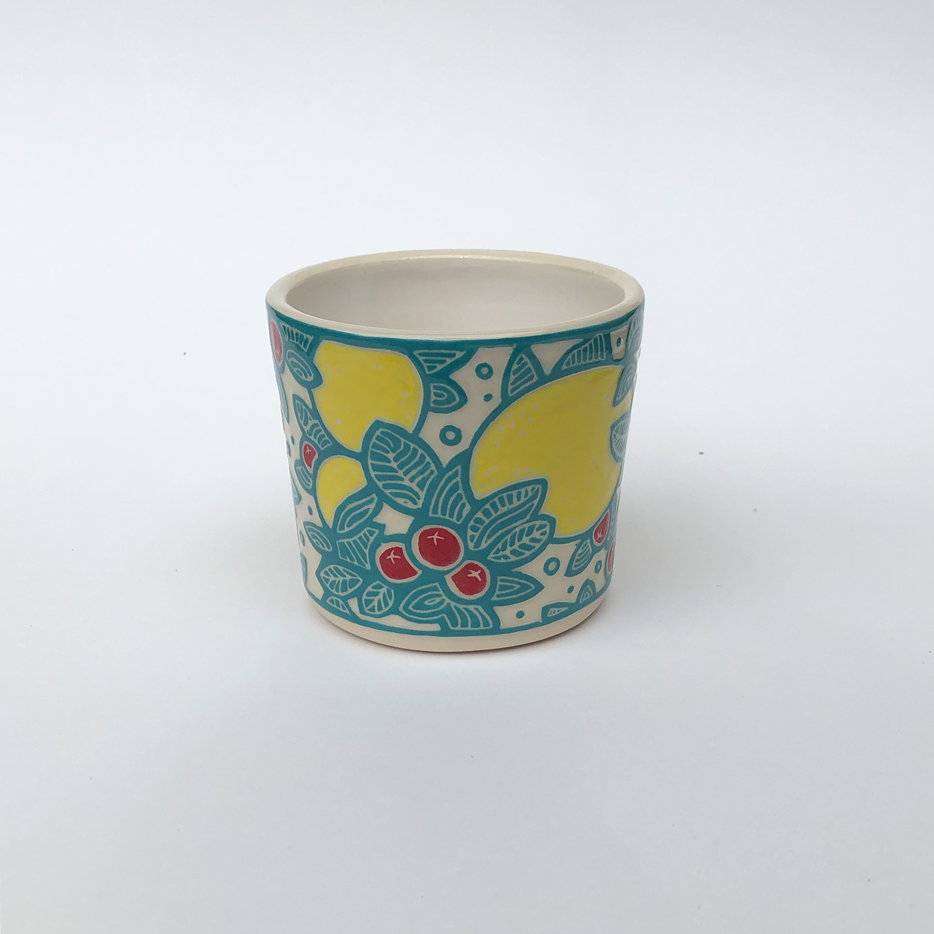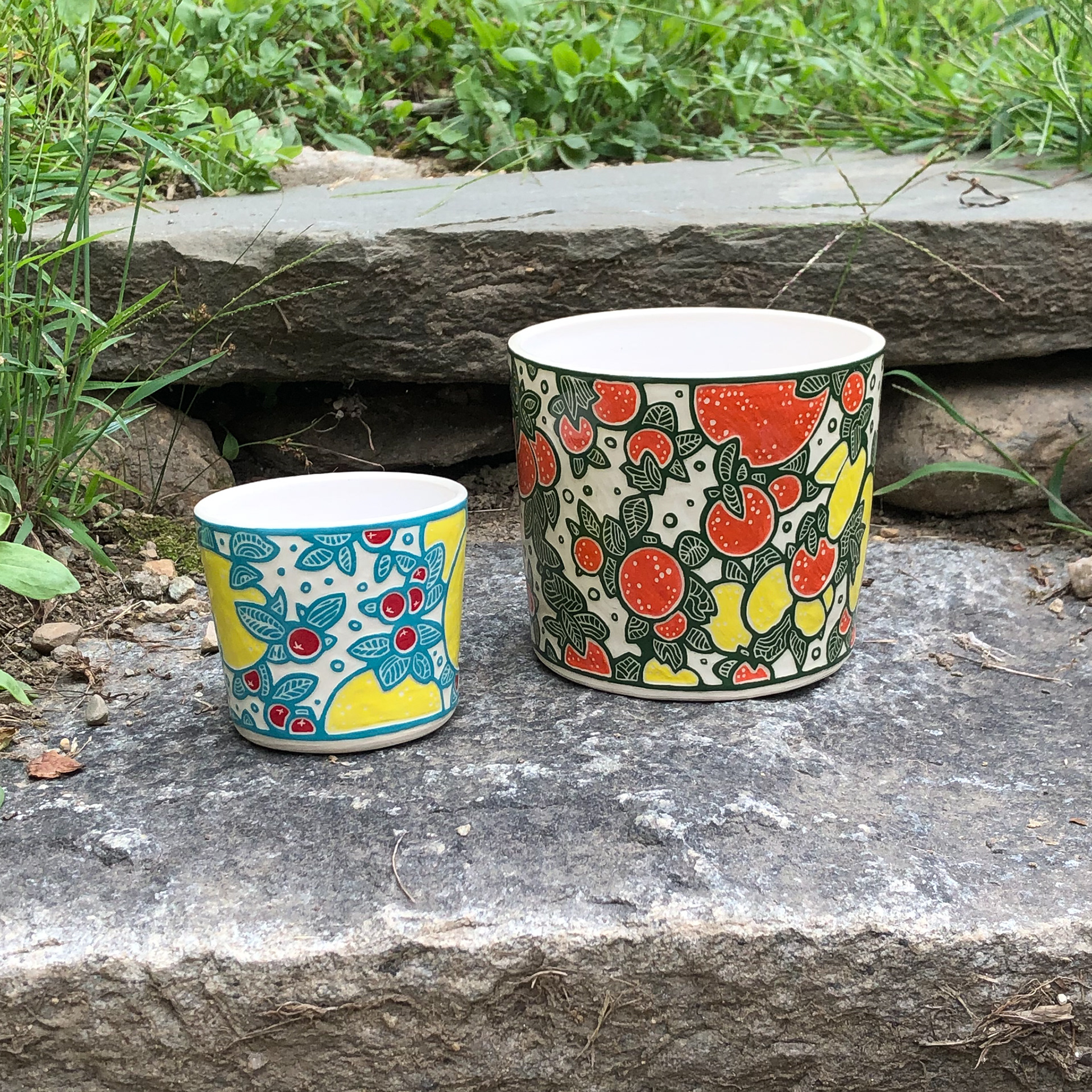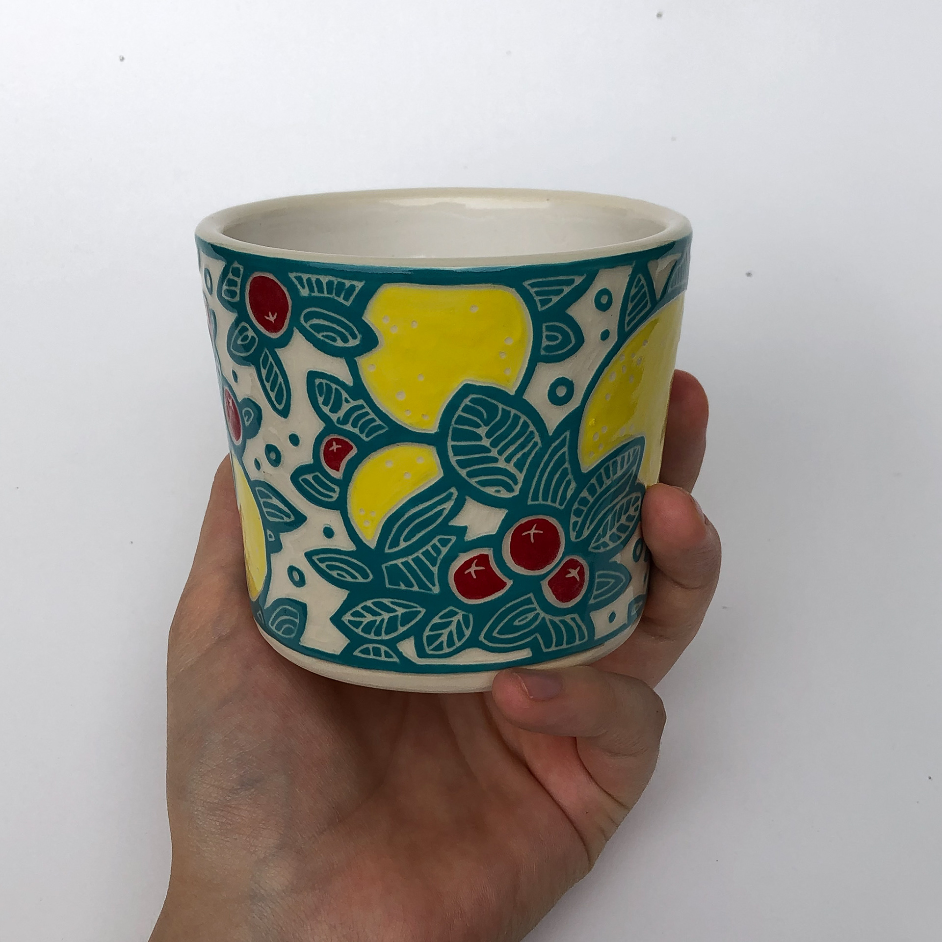 Wheel thrown porcelain with sgraffito surface designs carved through layers of painted underglaze.