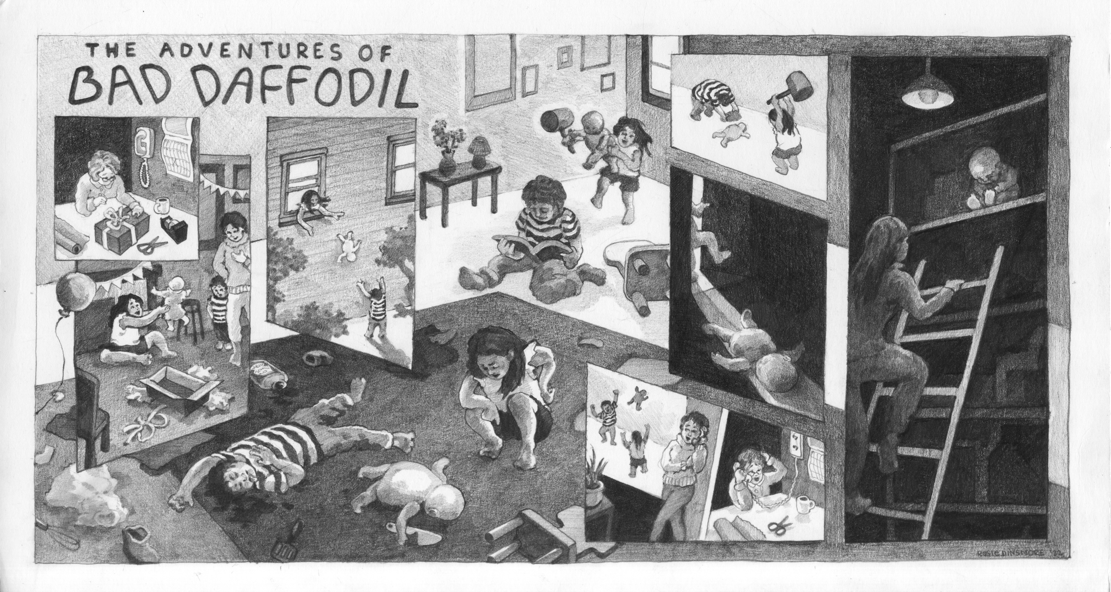 Graphite illustrated comic with digitally applied color in Adobe Photoshop.