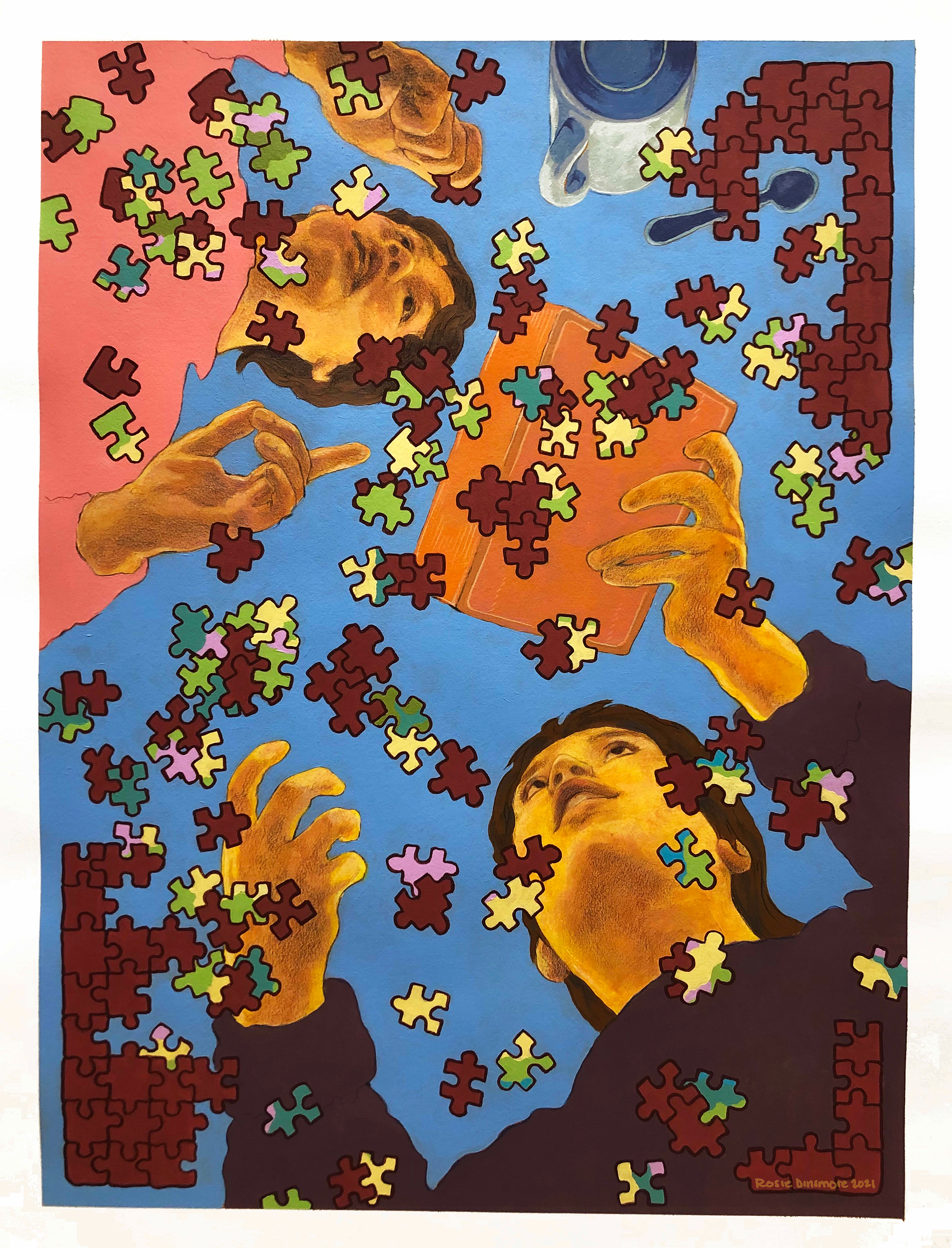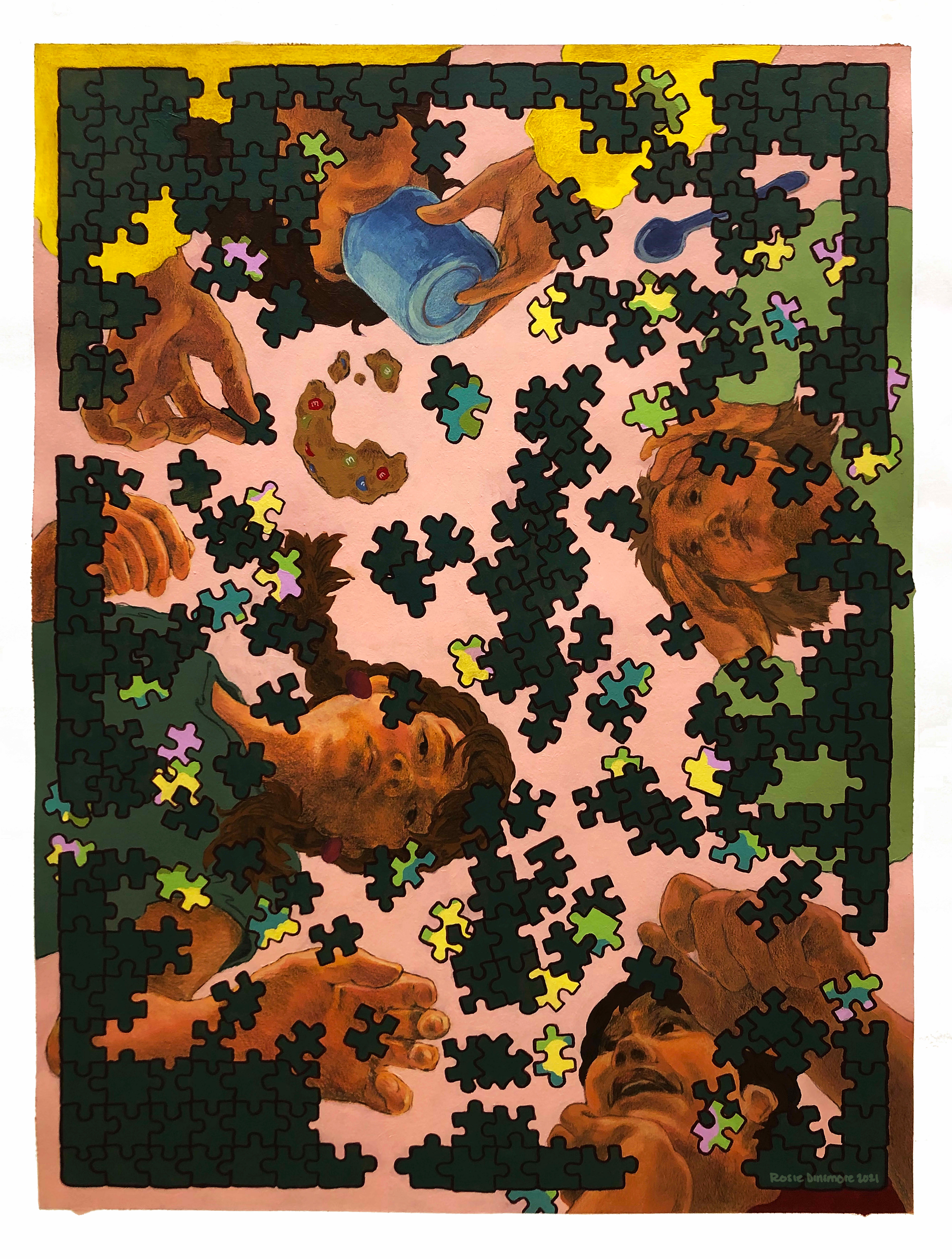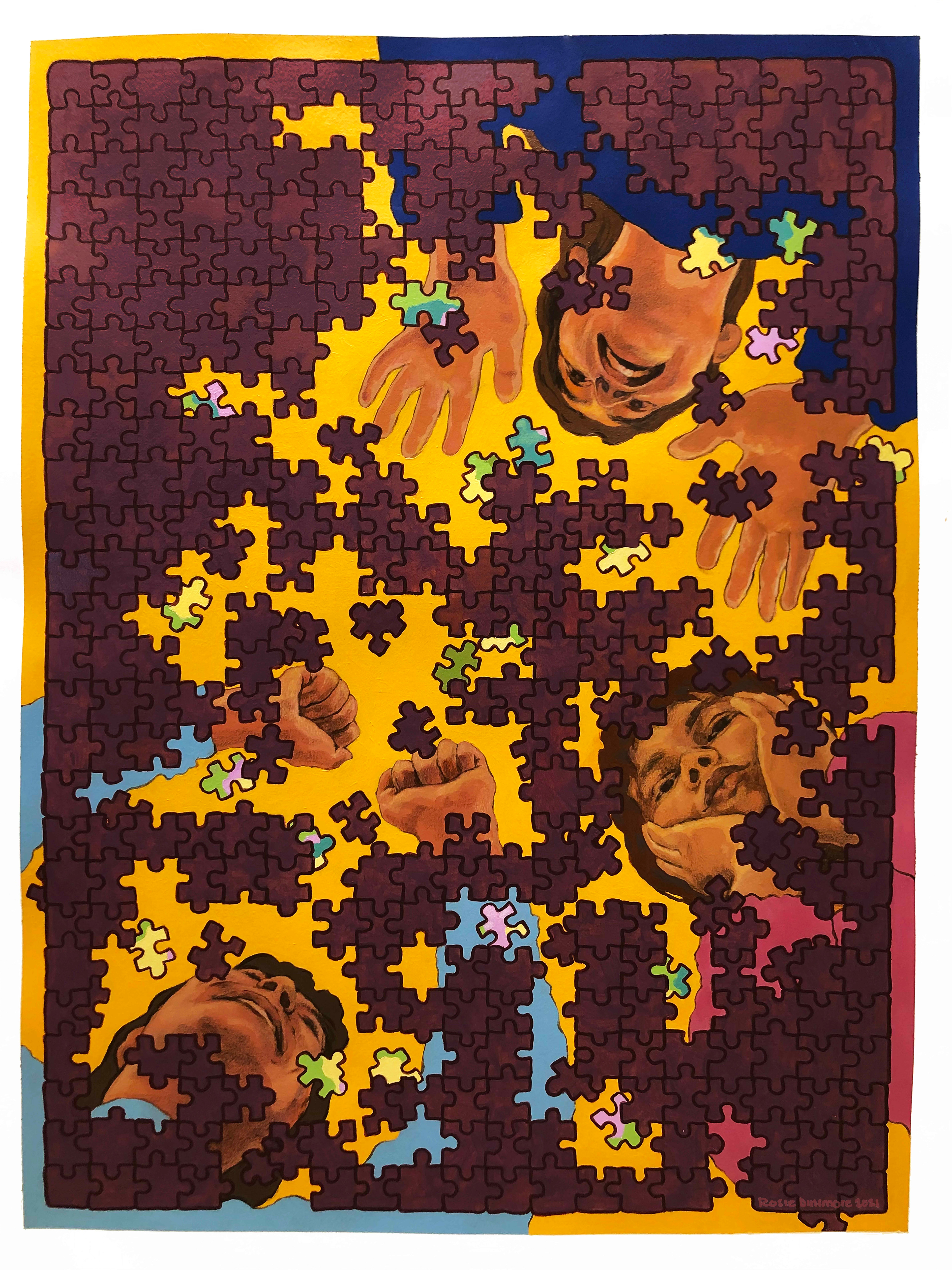 Triptych of three 20" x 27" paintings: acrylic and colored pencil on arches paper.
