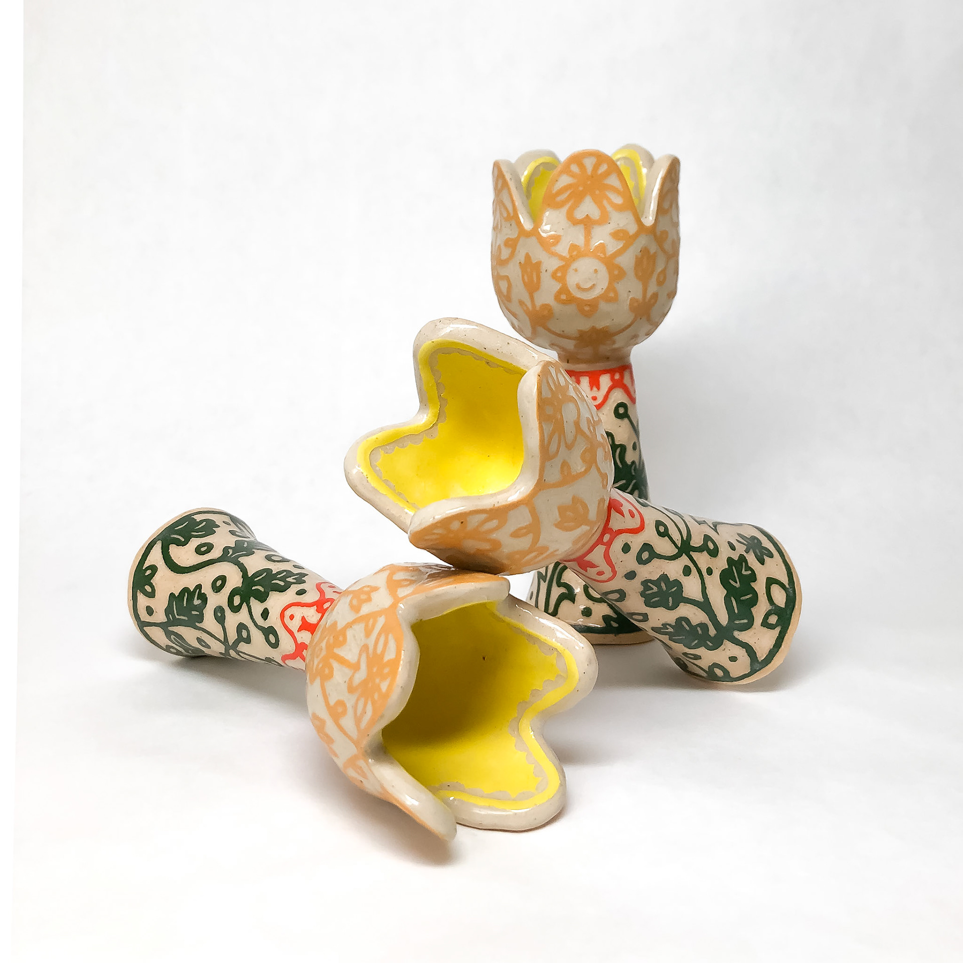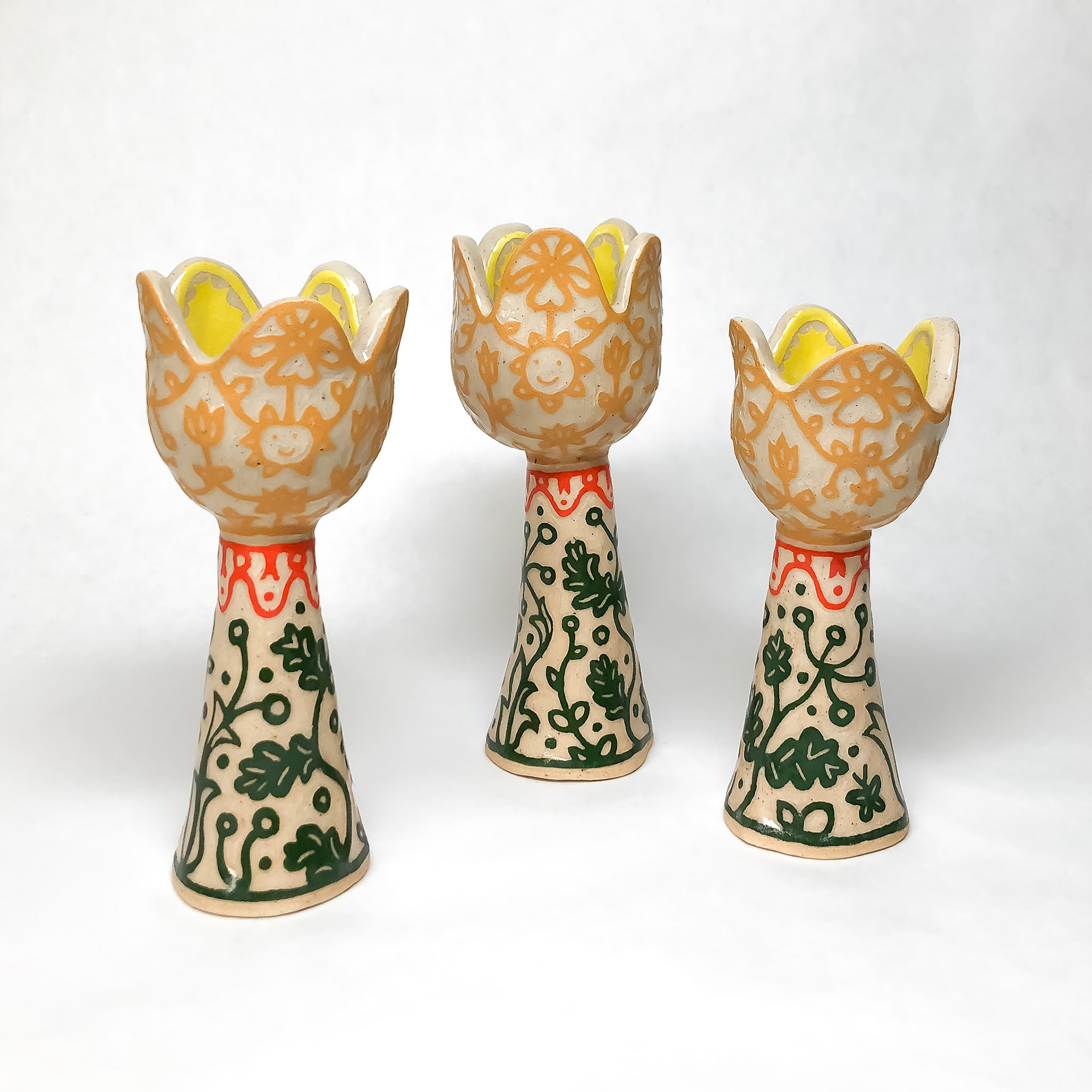 Hand-carved and handbuilt ceramic candlesticks; set of three.
